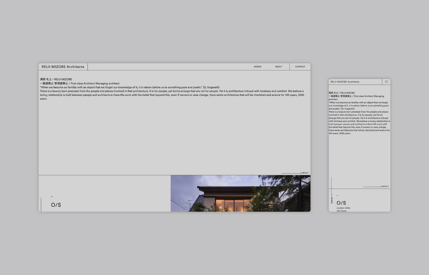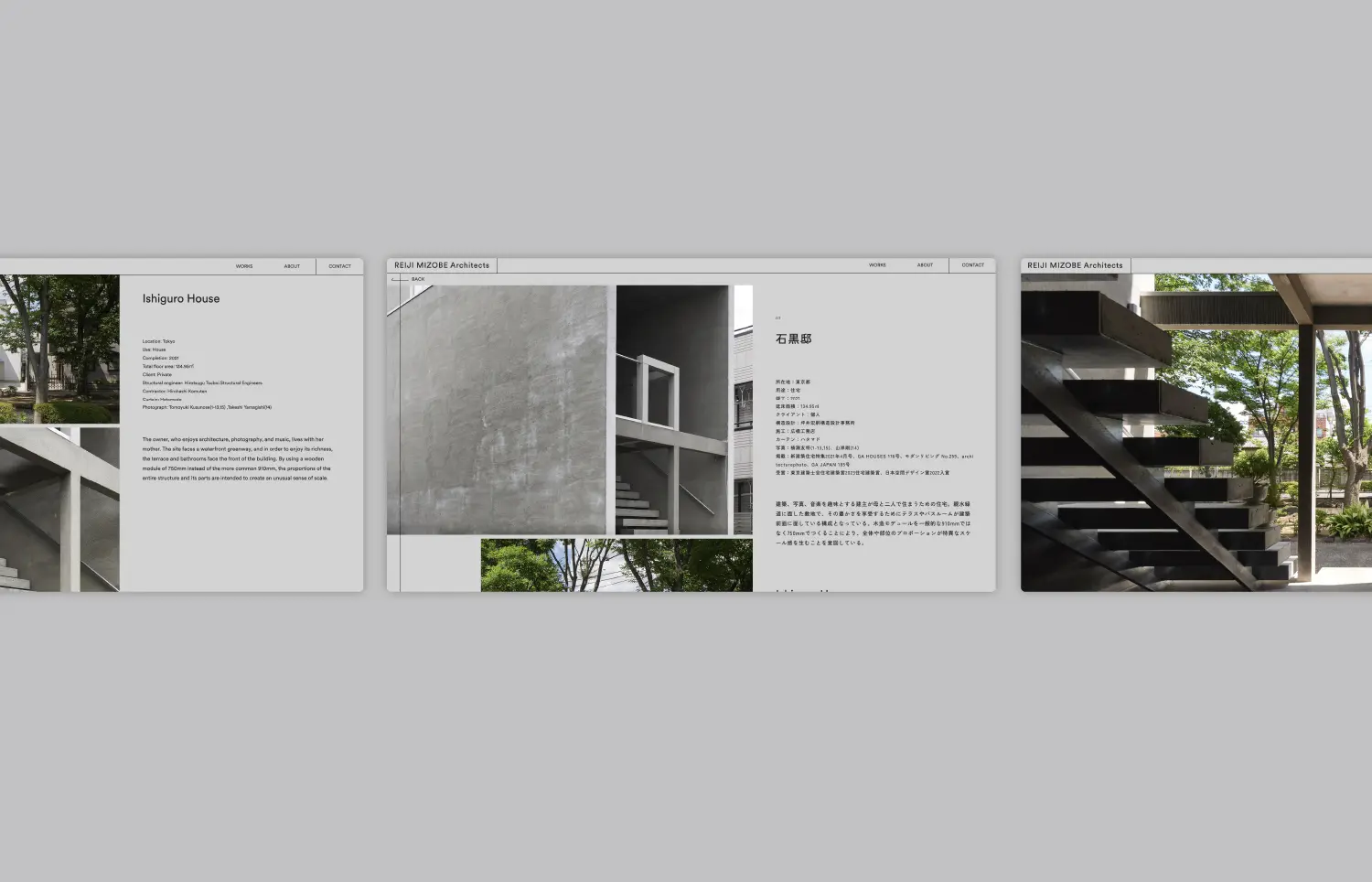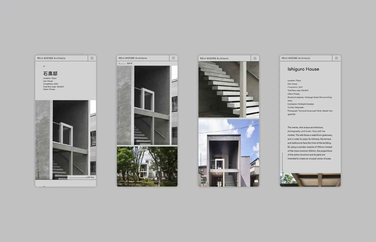空間のスケール感や素材の質感といった建築ならではのダイナミズムを少しでも伝えられるように、画像の並び方そのものにリズムを持たせています。細部までそぎ落としたデザインの中で、建築作品が最も美しく、誠実に語りかけてくる。そんなポートフォリオサイトを目指して制作しました。